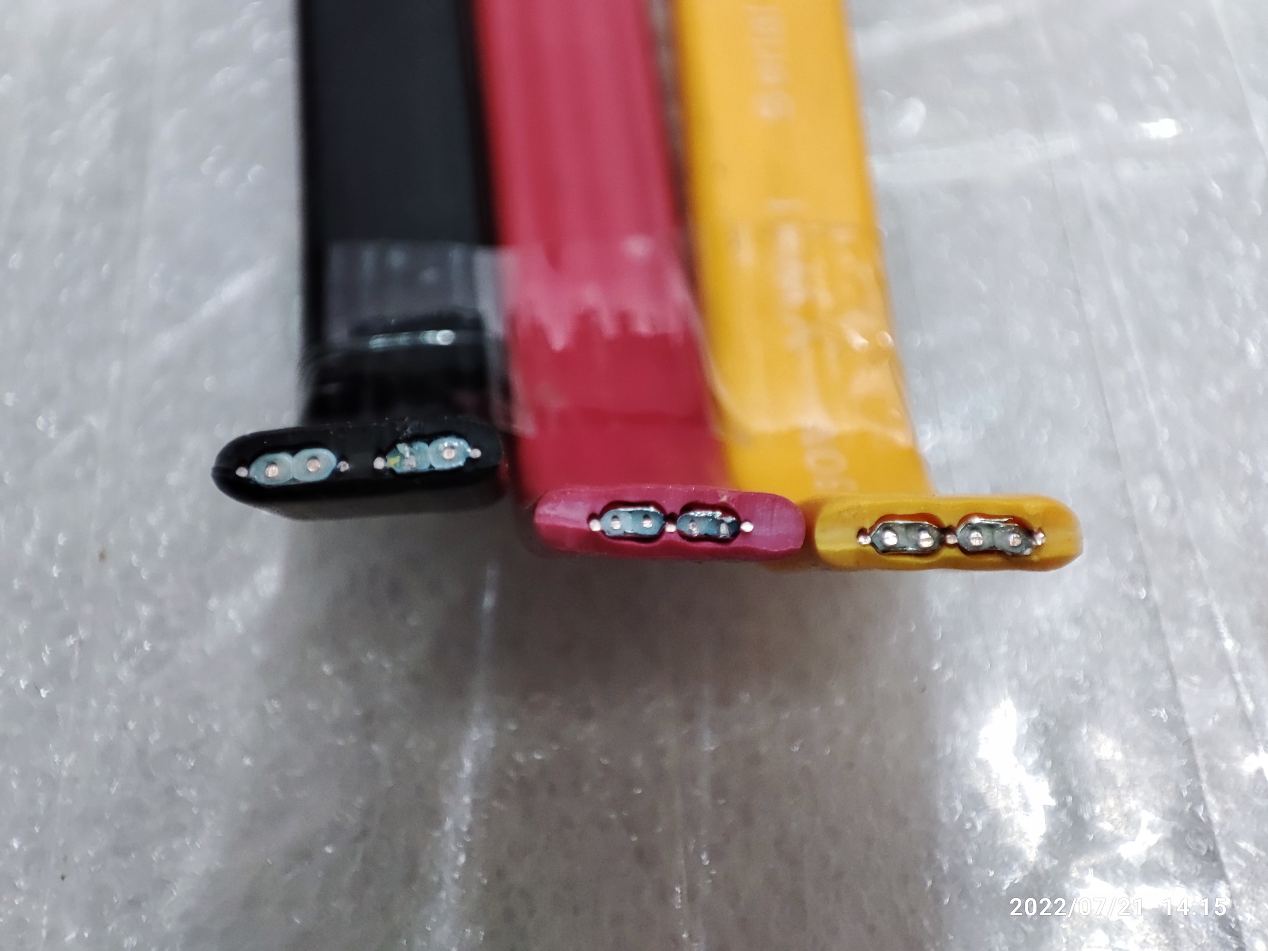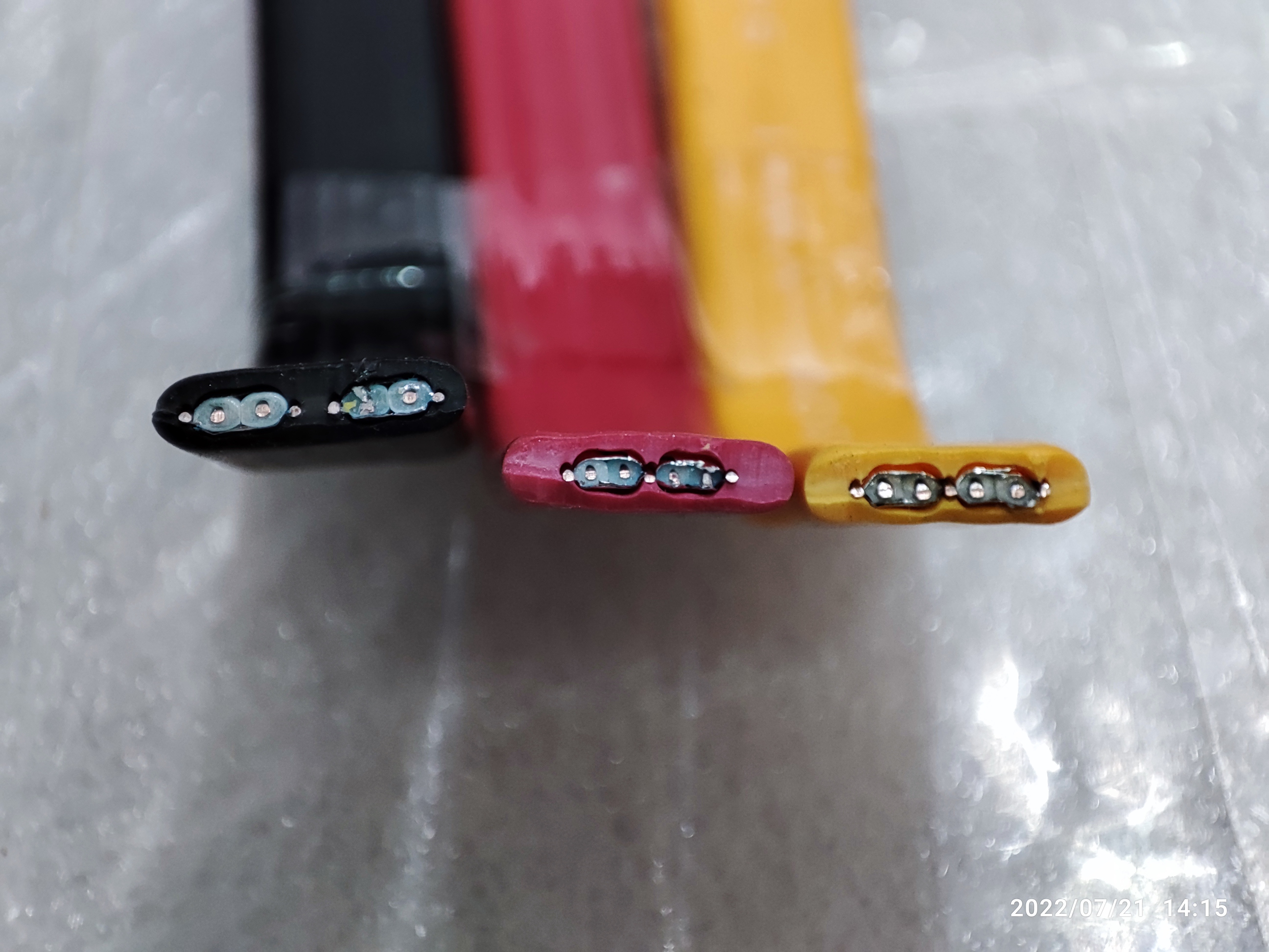 사타케이블 단면 사진입니다. (사타케이블의 내부 전선 구조) 일반적으로 많이 쓰였던 사타케이블 3개입니다. 검은색, 노란색, 빨간색 (제조사마다 다양한 색상을 만들기 때문에) 케이블을 색상으로 구별할 수는 없지만 노란색 케이블은 거의 10년 전에 많이 사용된 케이블이고 현재는 거의 볼 수 없습니다. 2022년 현재는 거의 검은색 사타 케이블이 대부분인데요. 검은색도 통짜로 일자로 된 케이블도 있고 중간에 라인을 넣어둔 케이블도 있고 그렇습니다. (메인보드 제조사마다 제공되는 기본 사타 케이블 종류가 다양합니다. 거의 민자랑 줄이 들어간 사타케이블 2종류가 많이 보이긴 하더라고요. 제조사를 들여다보진 않았습니다. 모양새만 봤을 때 그렇습니다.)