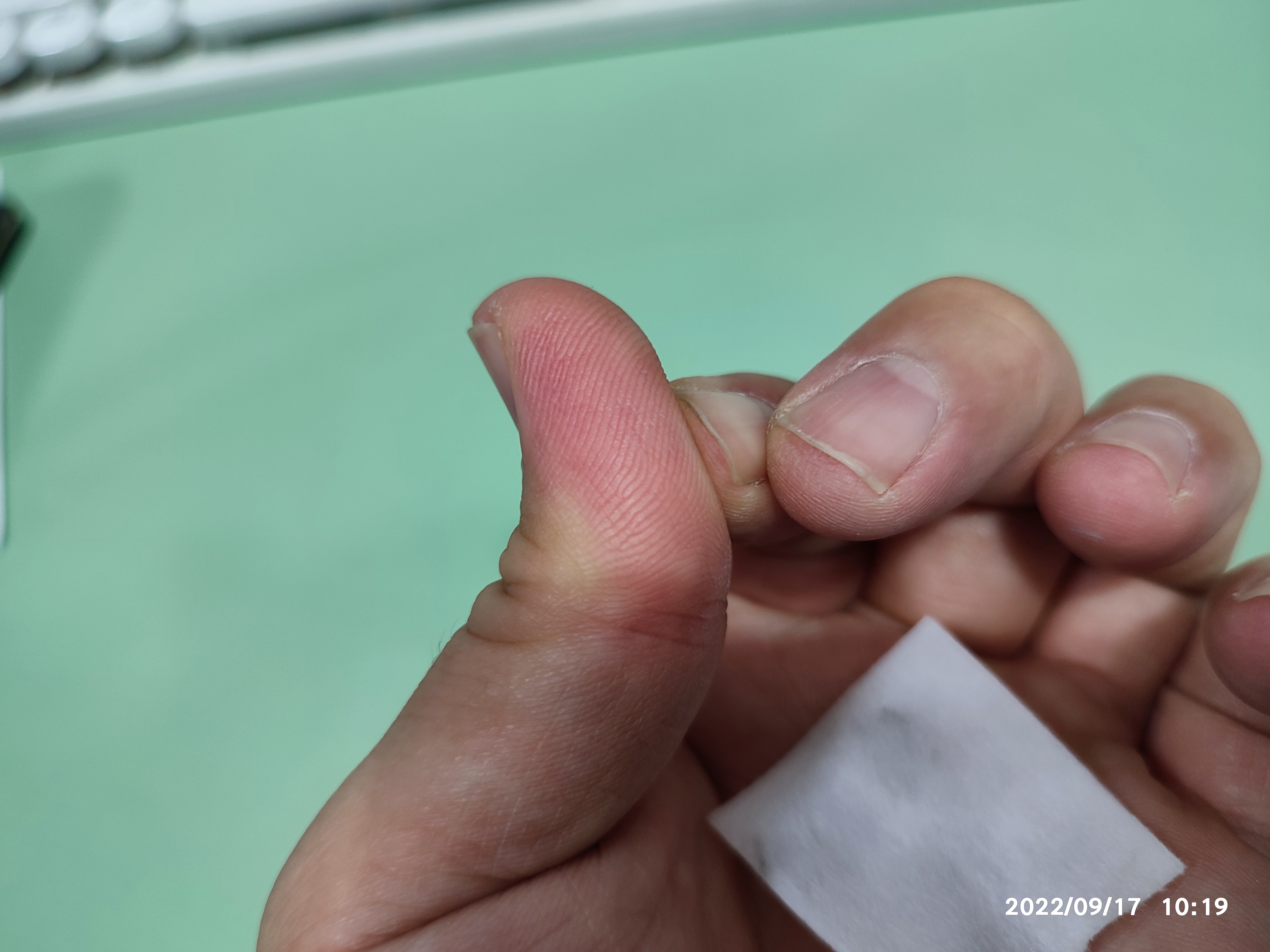 아무튼, 손가락에 서멀 묻으면 잘 안 닦여요. 특히 지문 사이에 써멀이 끼면 더 안 닦입니다. 물티슈보다는 알코올 솜이 있으면 훨씬 잘 닦이지만, 지문 사이는 잘 안 닦입니다. 그때는 손가락을 다른 손가락으로 누르고 닦으면 웬만하면 잘 닦입니다. 엄지 손가락도 검지 손가락으로 눌러서 피부가 밀리지 않게 고정시키고 닦으면 잘 닦여요.
